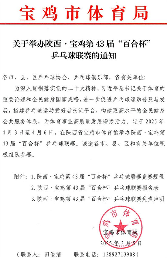 (三)联系电话:宝鸡市乒协办公室 0917—3313289