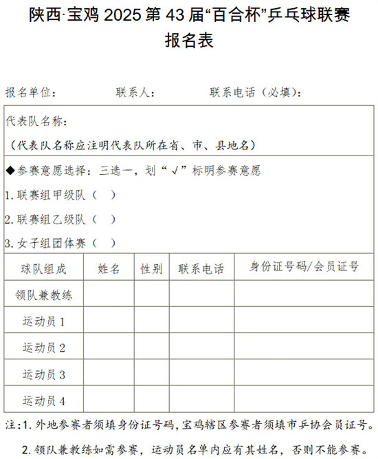 (四)参赛证件:宝鸡以外地区的运动员凭身份证及号码布(大会制作)参赛,宝鸡地区参赛人员须凭《宝鸡市乒协会员证》(注册至2025年)及人名布参赛。