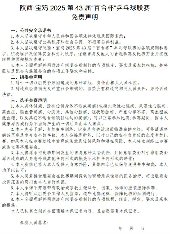 (二)组委会建议所有参赛选手通过正规医疗机构进行体检,并结合检测报告进行自我评估,确认自身状况能够适应比赛要求,方可选择项目报名参赛。在比赛中,因个人身体及其他个人原因导致的人身伤害或财产损失,由参赛者自行承担责任。同时,各代表队需签《陕西·宝鸡2025第43届“百合杯”乒乓球联赛免责声明》。